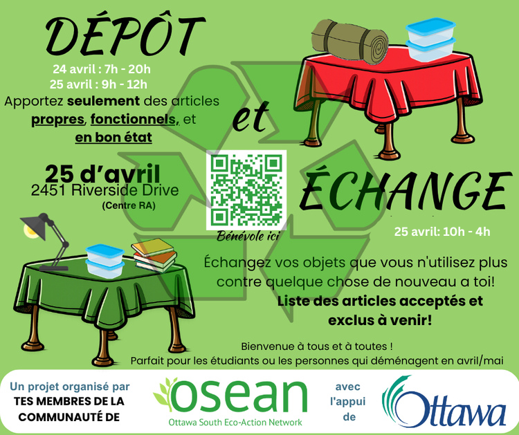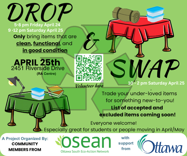 Join Ottawa South Eco-Action Network (OSEAN), Eco West Enders and the City of Ottawa for a free Swap event on April 25th at the RA Centre, Clark Hall! More info here.