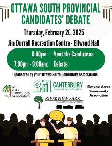 Please join your neighbours at the Ottawa South Provincial Candidates’ Debate on Thursday February 20, 2025.